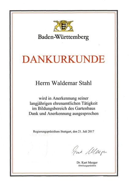 Waldemar Stahl war als Prüfungsmeister zur Abnahme von Gesellenprüfungen tätig und erhielt vom Land Baden-Württemberg eine Ehrung für 13 Jahren Ehrenamt.